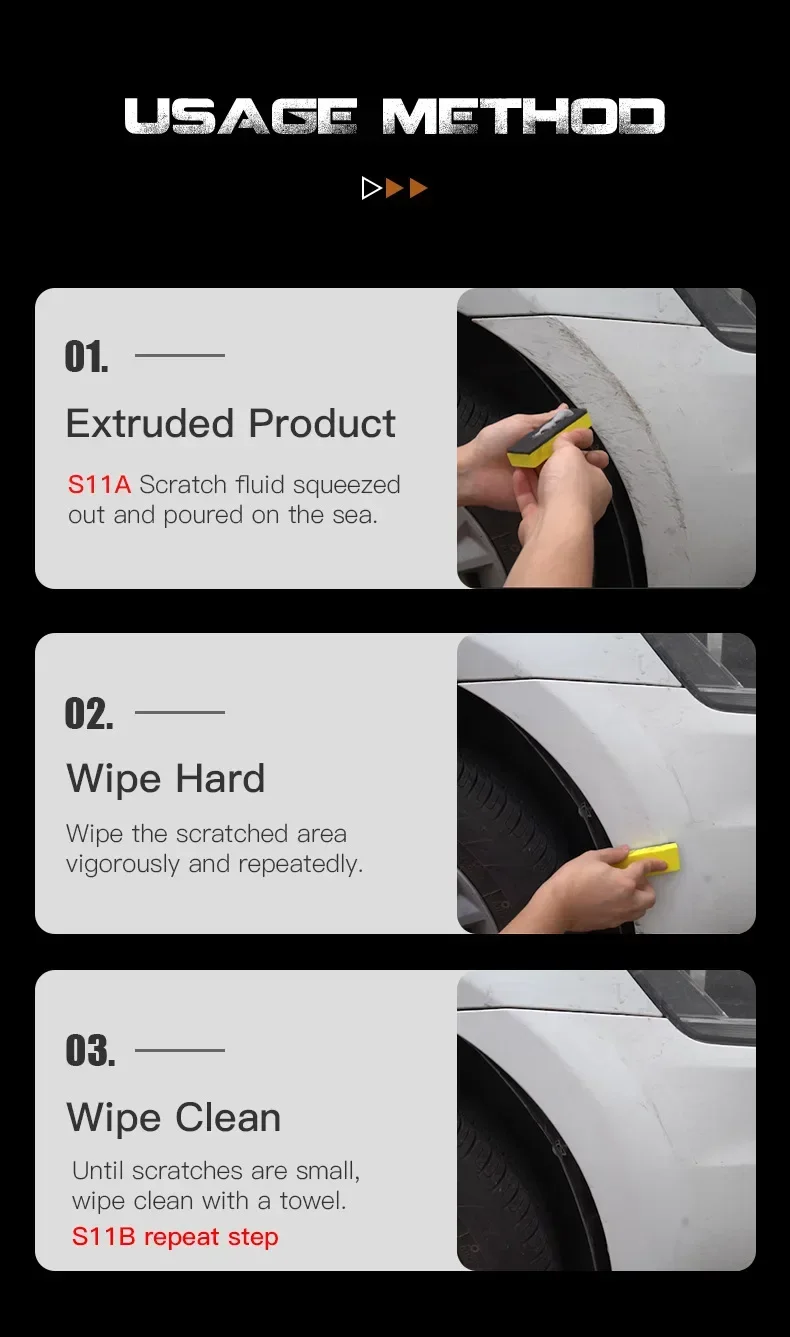 1.Pour the S11A onto a microfiber towel and polish hard on the scratch until the scratch fades or disappears.