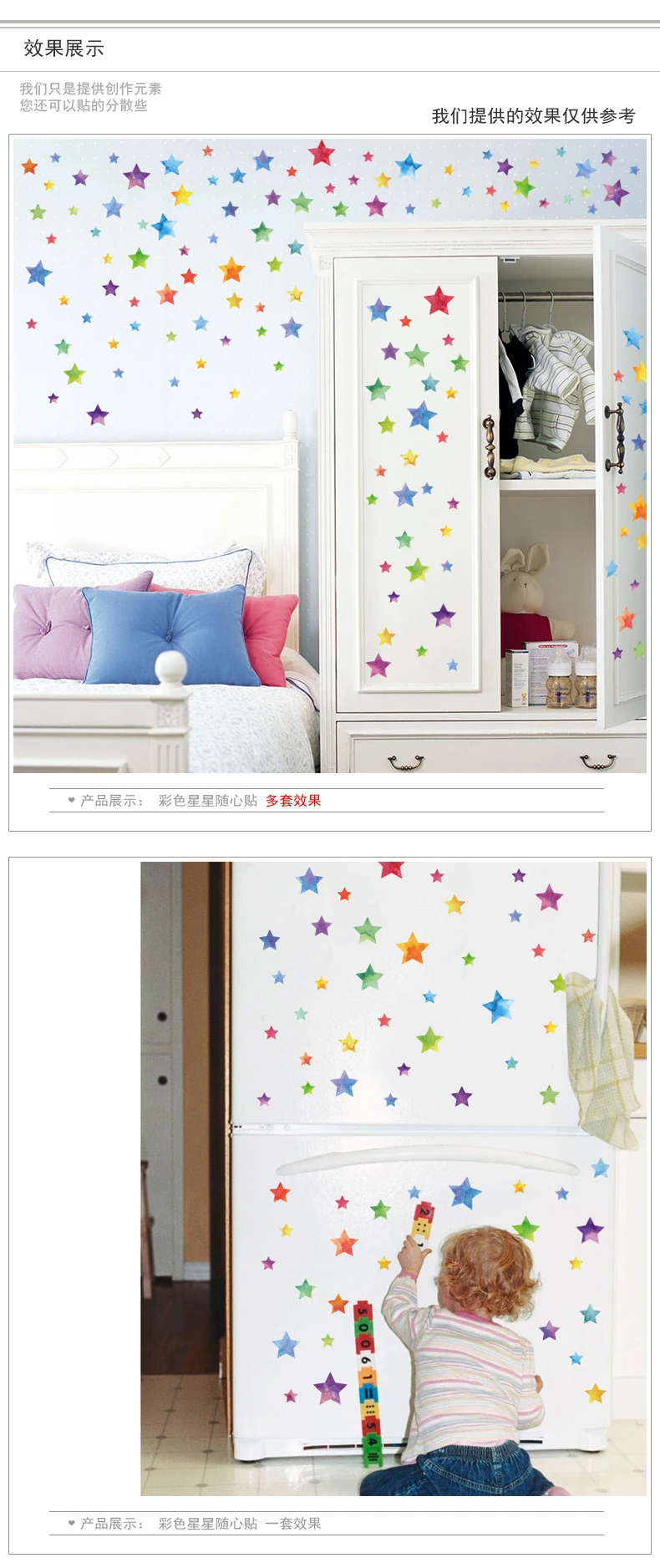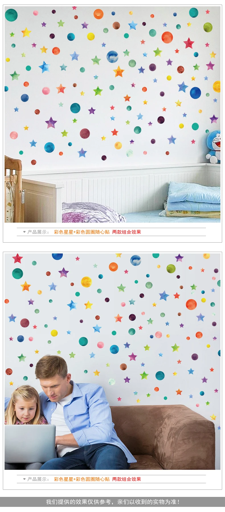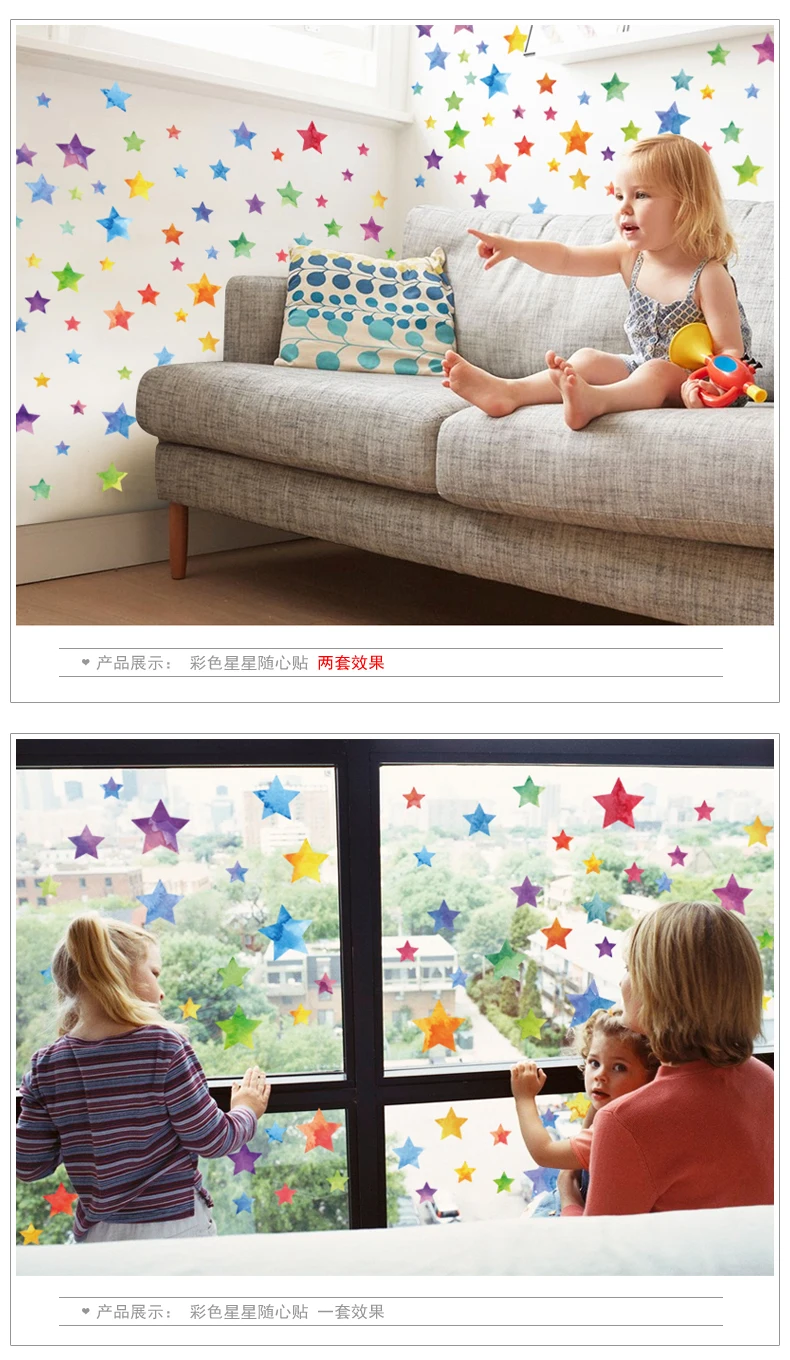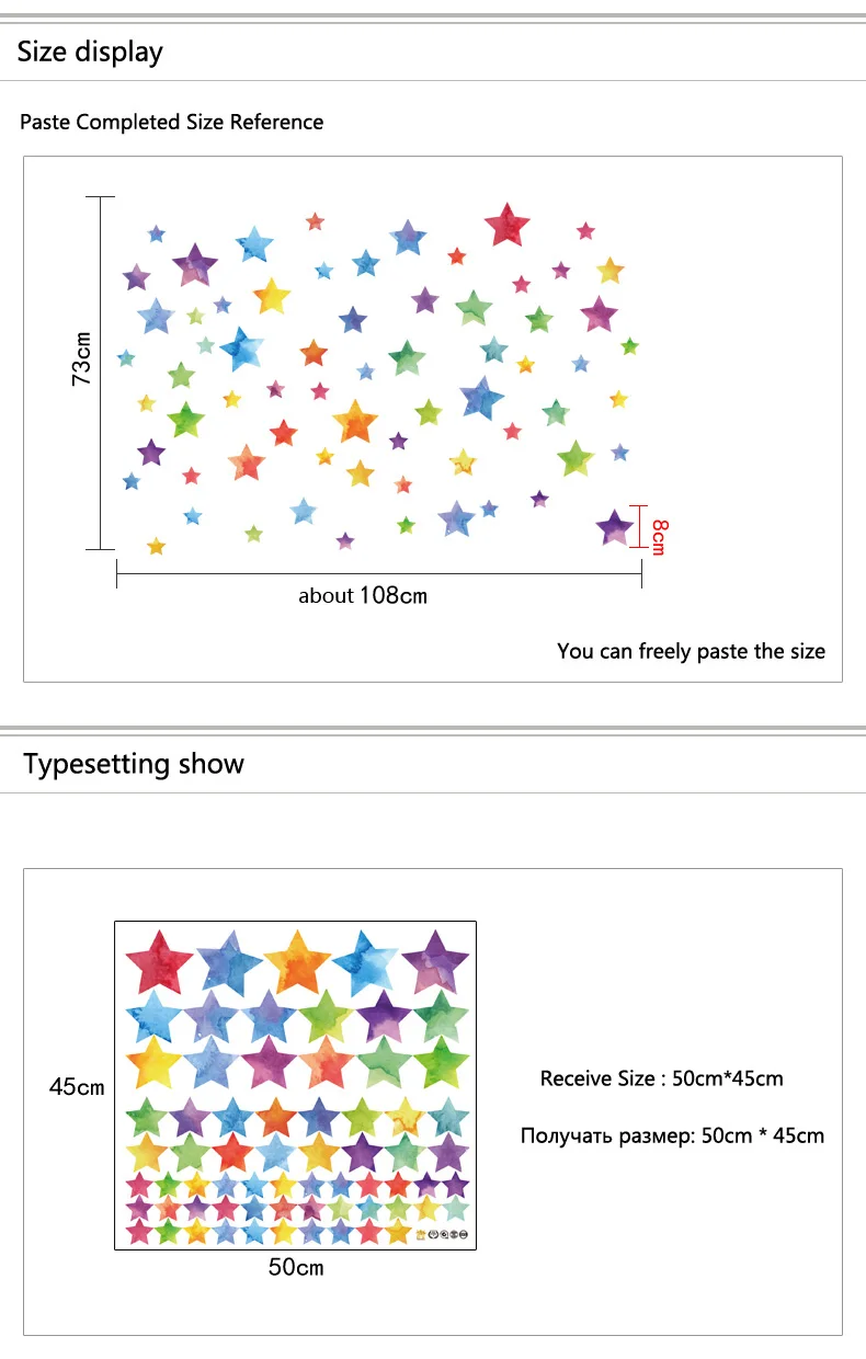 Rainbow Color Dots Star Wall StickerProduct receive size: 45cm * 50cmPaste Completed Size Reference.: about 95cm * 68cmSize is for reference only. The size you can paste freely.Material: Eco-friendly PVC************************************************** ************************************************** *************************Product Features:Environmentally friendlyRemovable, waterproof,mildew proofDouble-sided visual patterns;No marks will be leftCan be applied to any smooth and clean surfaces such as walls, doors, windows, closet, etc.Decorate your home, make it more romanticTry not to paste again and again.NOT suitable for dirty or rough surfaceReference:1. determine is affixed to the surface of a smooth surface, there is convex and concave and folds parts do not paste the.2. Paste the selected location, clean up dust and grease are veneer, ensure that the surface dry and clean.3. Paste according to the order to do simple planning, of course, also be carried out in accordance with their own creative DIY.4. The stickers and gently peel off the backing paper paste, not need transfer film, stick the middle of the first to the left and then paste pave pressed.
